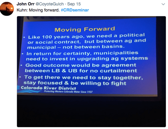 Dave Kanzer from the Colorado River District moderated a panel about irrigation efficiency. The goal is to avoid unexpected consequences such as increased salinity or less water in the streams due to lower return flows.