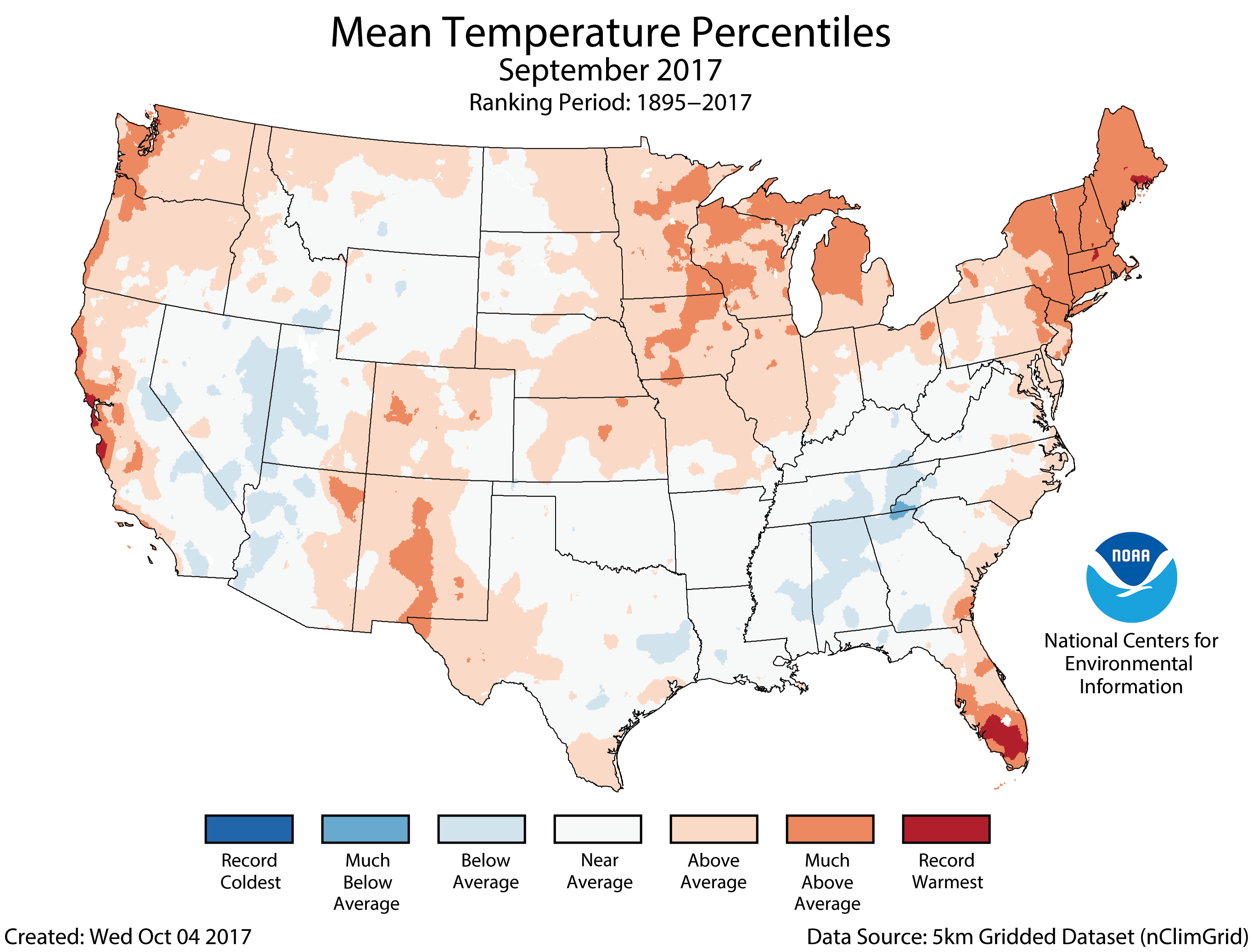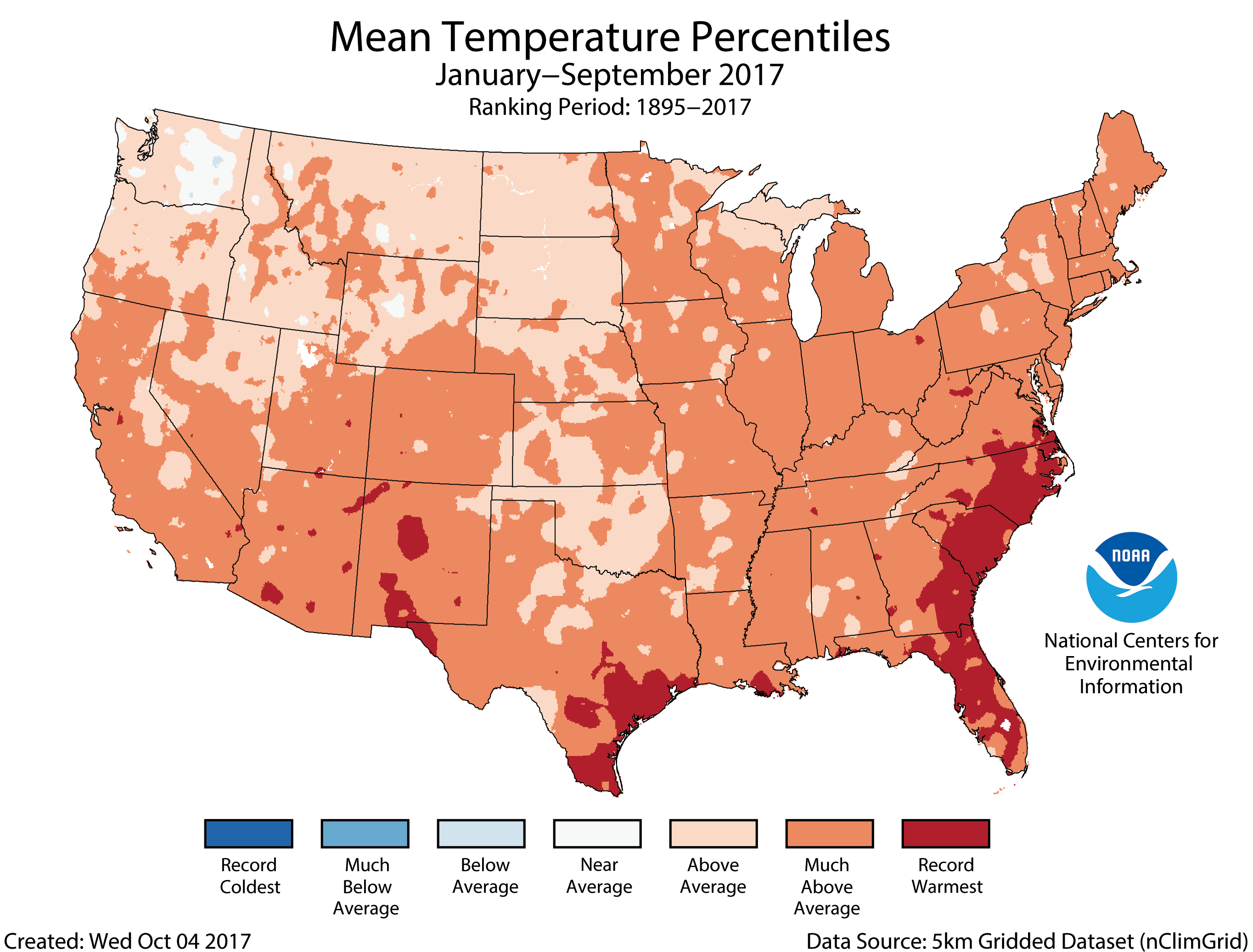 The September nationally averaged temperature was 66.3°F, 1.4°F above the 20th century average, and ranked among the warmest third of the historical record. Near-record warmth was observed in parts of the Great Lakes and Northeast. The year-to-date U.S. average temperature was the third warmest on record at 57.7°F, 2.7°F above average. Only January–September of 2012 and 2016 were warmer. Above-average temperatures spanned the nation for the first nine months of the year.