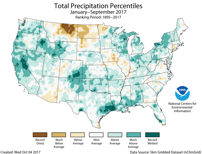 Most locations had wetter than average conditions during January-September. Much-above-average precipitation was observed across the West, and parts of the Southern Plains, central Gulf Coast, and Great Lakes. Eleven states were much wetter than average, while no state was record wet. Conversely, below-average precipitation was observed across the Northern Rockies and Northern Plains. No state was record dry.