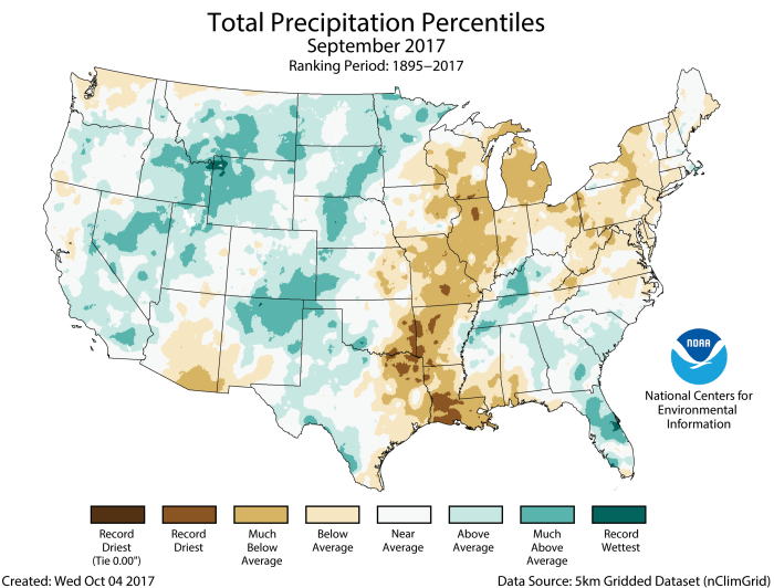 For September, the national precipitation total was 2.22 inches, 0.27 inch below average, and ranked among the driest third of the historical record. Much-below-average precipitation fell in the Lower and Mid-Mississippi Valley and the central Great Lakes with above-average precipitation for the Rockies, Northern Plains, and Southeast. The year-to-date U.S. precipitation total was 26.36, 3.16 inches above average. This was the wettest January–September on record, surpassing the previous record set in 1979.