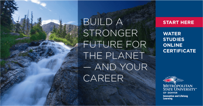 MSU Denver’s Water Studies Online Certificate is one of the only certificates in the country with a special focus on water in Colorado and the American West. The certificate will allow you to expand your knowledge about water stewardship under the direction of highly qualified instructors, in a self-paced format, with an applied real-world project.