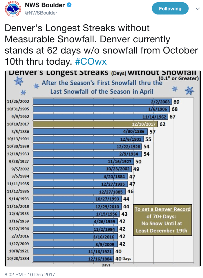 This comes on the heels of the warmest November on record, as Colorado Public Radio reported. Despite the many warm days, it was higher than normal overnight lows that tipped us over.