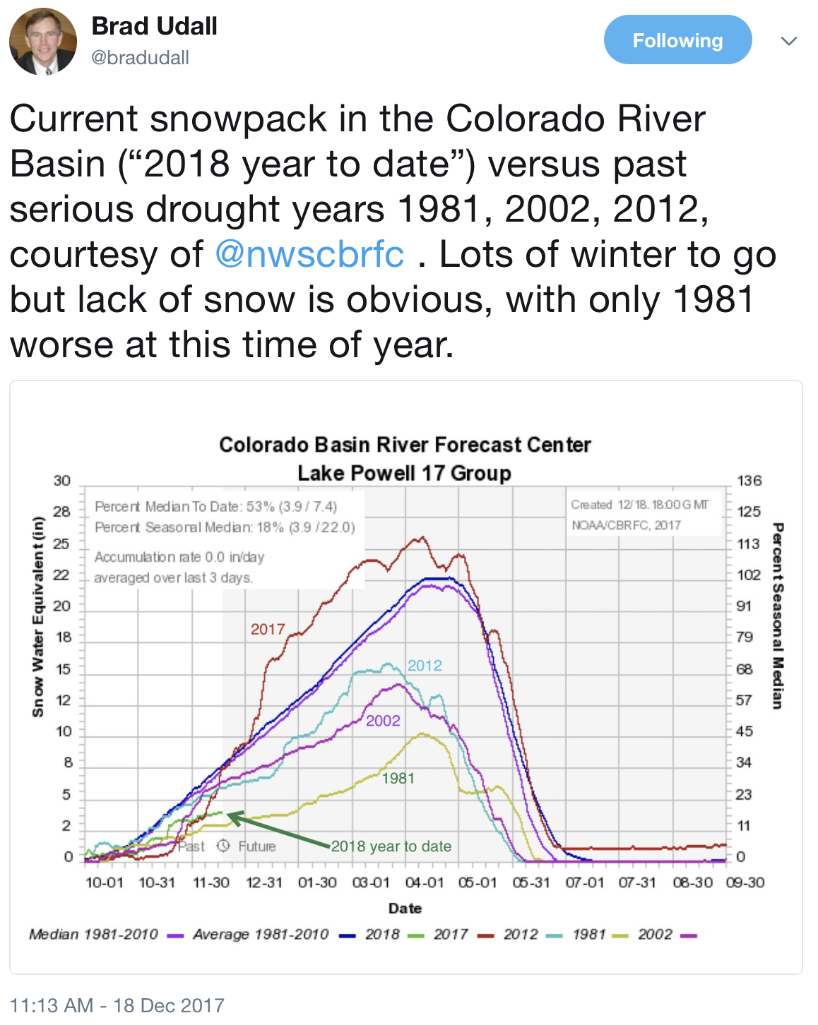 Upper Colorado River Basin High/Low graph December 17, 2017 via the NRCS.