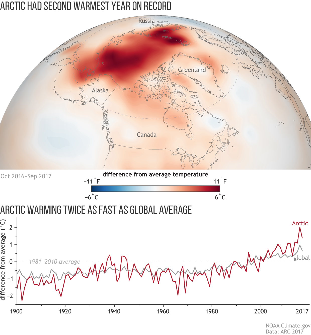 Below the map is a graph that compares the history of surface temperatures at land stations in the Arctic (red line) to the whole globe (gray line). Each year temperature is compared to the 1981-2010 average (dashed line at zero). The past year was slightly cooler than 2016, but it was still nearly 1.5 degrees Celsius warmer than the 1981-2010 average. The rate of warming in the Arctic is twice the rate occurring over the globe as a whole.