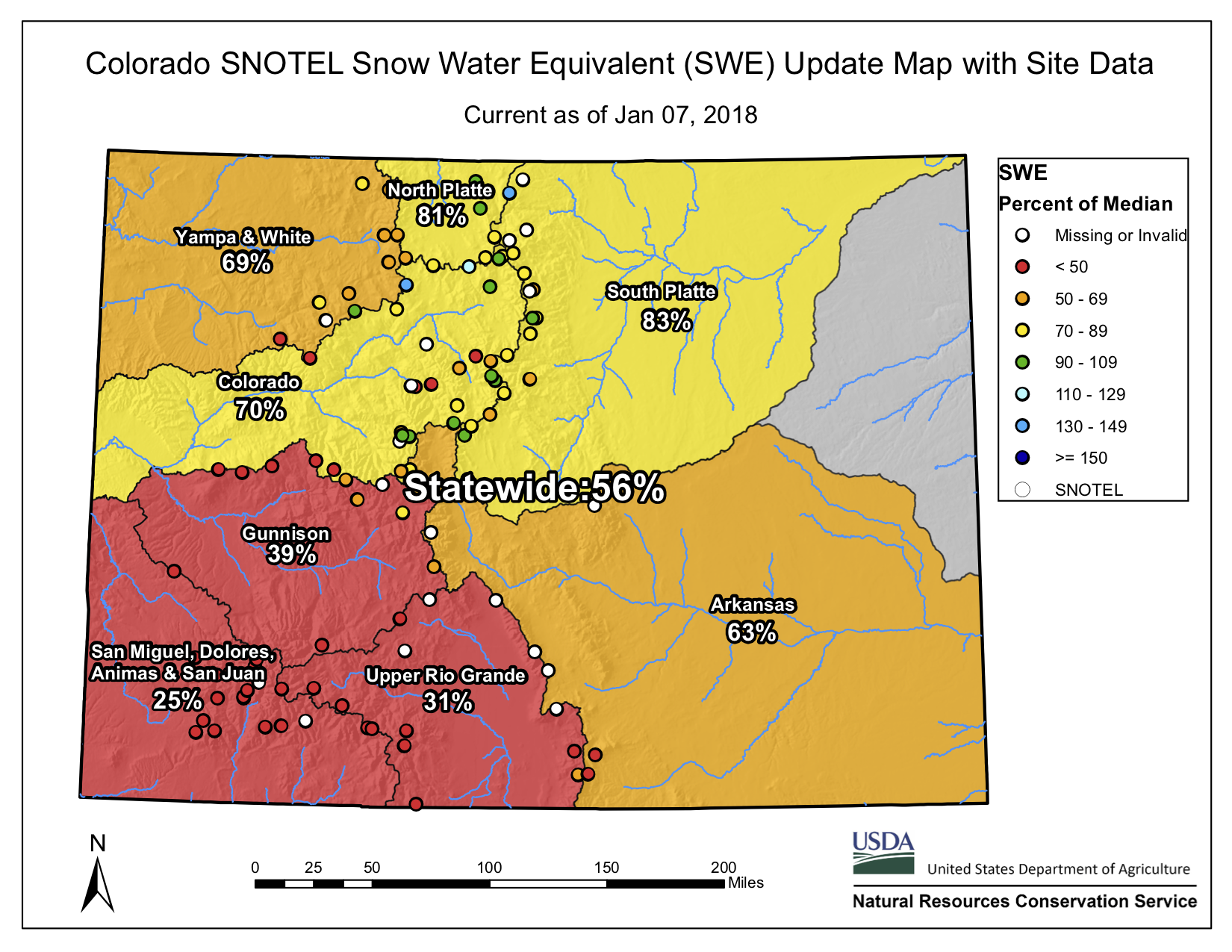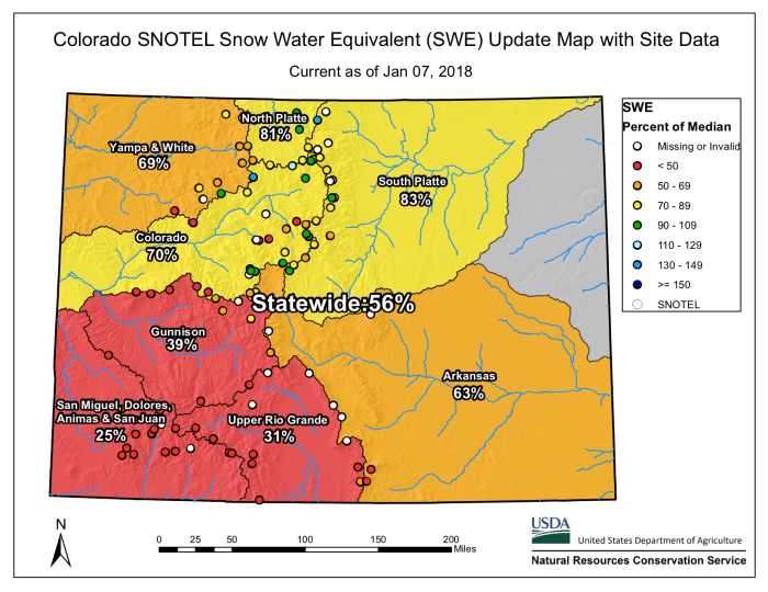 Statewide snowpack January 7, 2018 via the NRCS.