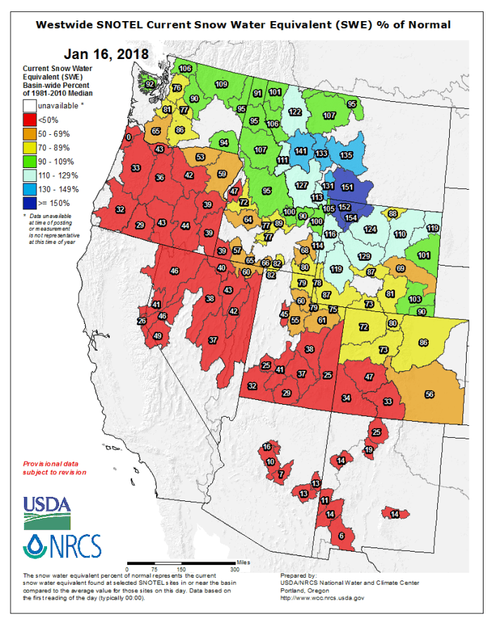 And here’s the Westwide SNOTEL basin-filled map for January 16, 2018 from the NRCS.