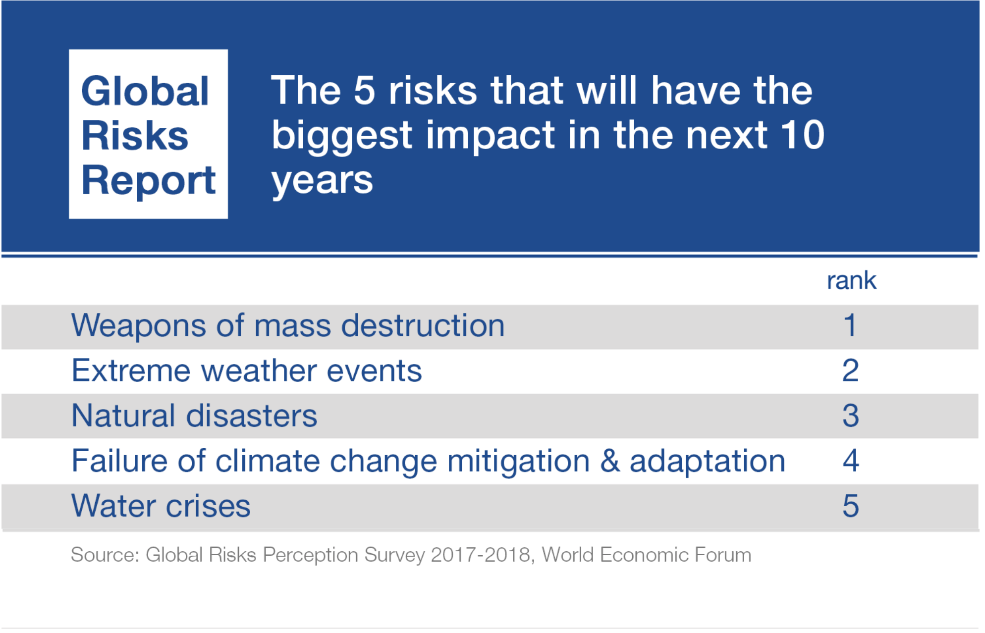 The 2018 World Economic Forum’s Global Risks Report makes this crystal clear. Three global environmental risks now dominate the report both for likelihood and impact: extreme weather, natural disasters and failure to act at the necessary speed to mitigate climate change. This message was reinforced recently by Mark Carney, chair of the G20 Financial Stability Board, who said: “Once climate change becomes a clear and present danger to financial stability it may already be too late to stabilize the atmosphere at two degrees.”