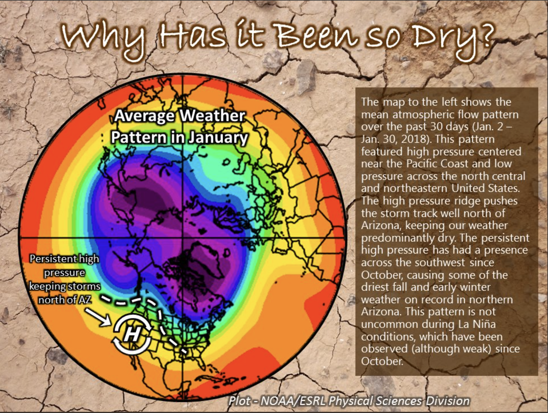 With dry weather dominating the West this week and much of the last six or more months, D0 was expanded from California and Nevada northward across the Great Basin to Oregon and southern Idaho. Outside of the Pacific Northwest, impacts from drought were common across the West. As reported by the Nevada State Climatologist, dry conditions in northwest and eastern Nevada were impacting area ranchers. As reported to the National Weather Service, in southern Arizona ranchers were already starting (or preparing) to haul water for livestock as ponds were drying up. This is more typical of spring than mid-winter. Reports from drought wells in the southeast part of the state show declines more rapid than experts have ever seen down there, although some of the decline may be due to increased demand as ponds are drying up. CoCoRaHS condition reports included no forage for livestock on the hillsides in southern Arizona, and ranchers were hauling water for livestock in Gila County. Mountain snowpack was abysmally low, reaching record low levels for this time of year in parts of New Mexico and Colorado. Temperatures during the last three months have been well above average for much of the Southwest, including California, and this has increased evaporative demand which tends to dry out vegetation, soils, and water resources faster than under normal temperature conditions. The increased evaporation, combined with low precipitation, has helped expand drought in the Southwest. D1-D2 expanded in New Mexico and Utah, D1 protruded further into eastern Nevada, D2 grew in Arizona, and spots of D3 were added to Arizona.