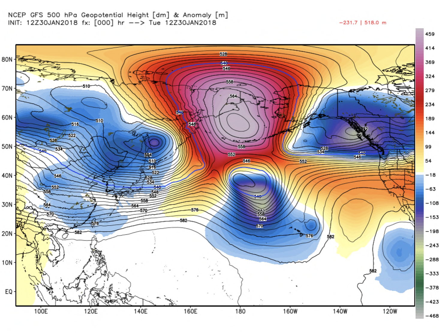 Underneath this high pressure zone, models show temperature differences from normal exceeding 50 degrees over a broad area. Weather.US meteorologist Ryan Maue tweeted that these temperature anomalies are “off the charts.”