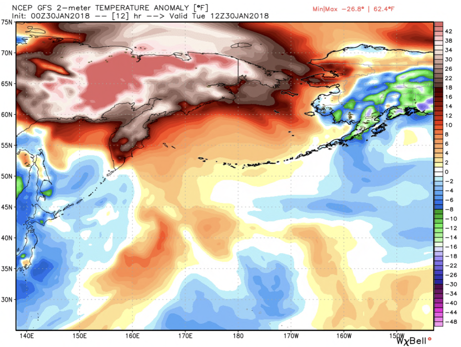 Temperature difference from normal simulated by the GFS model on Tuesday over eastern Russia and western Alaska. (WeatherBell.com)