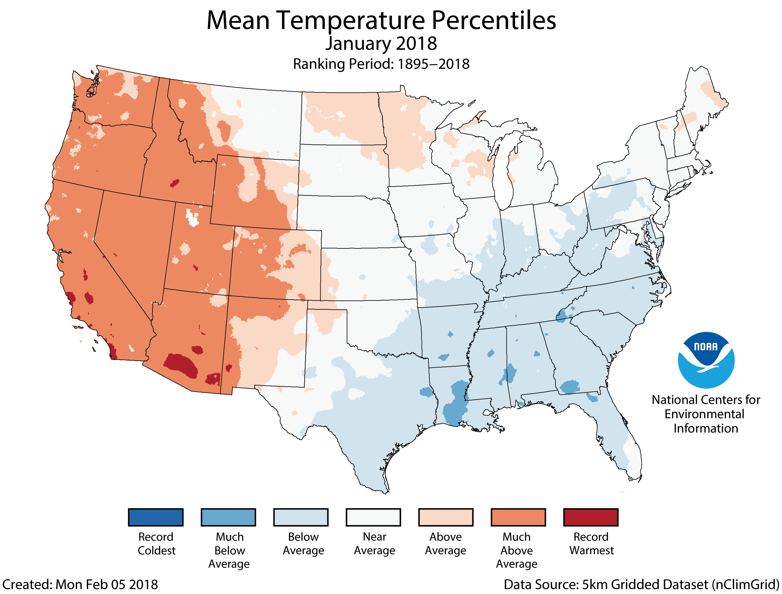 During January, the average contiguous U.S. temperature was 32.2°F, 2.1°F above the 20th century average. This ranked among the warmest third of the 124-year period of record. Much-above-average temperatures in the West offset below-average conditions in the East. The January precipitation total was 1.81 inches, 0.50 inch below the 20th century average. This tied the 21st driest January on record. Drought intensified and expanded across parts of the West, Southern Plains and Southeast.