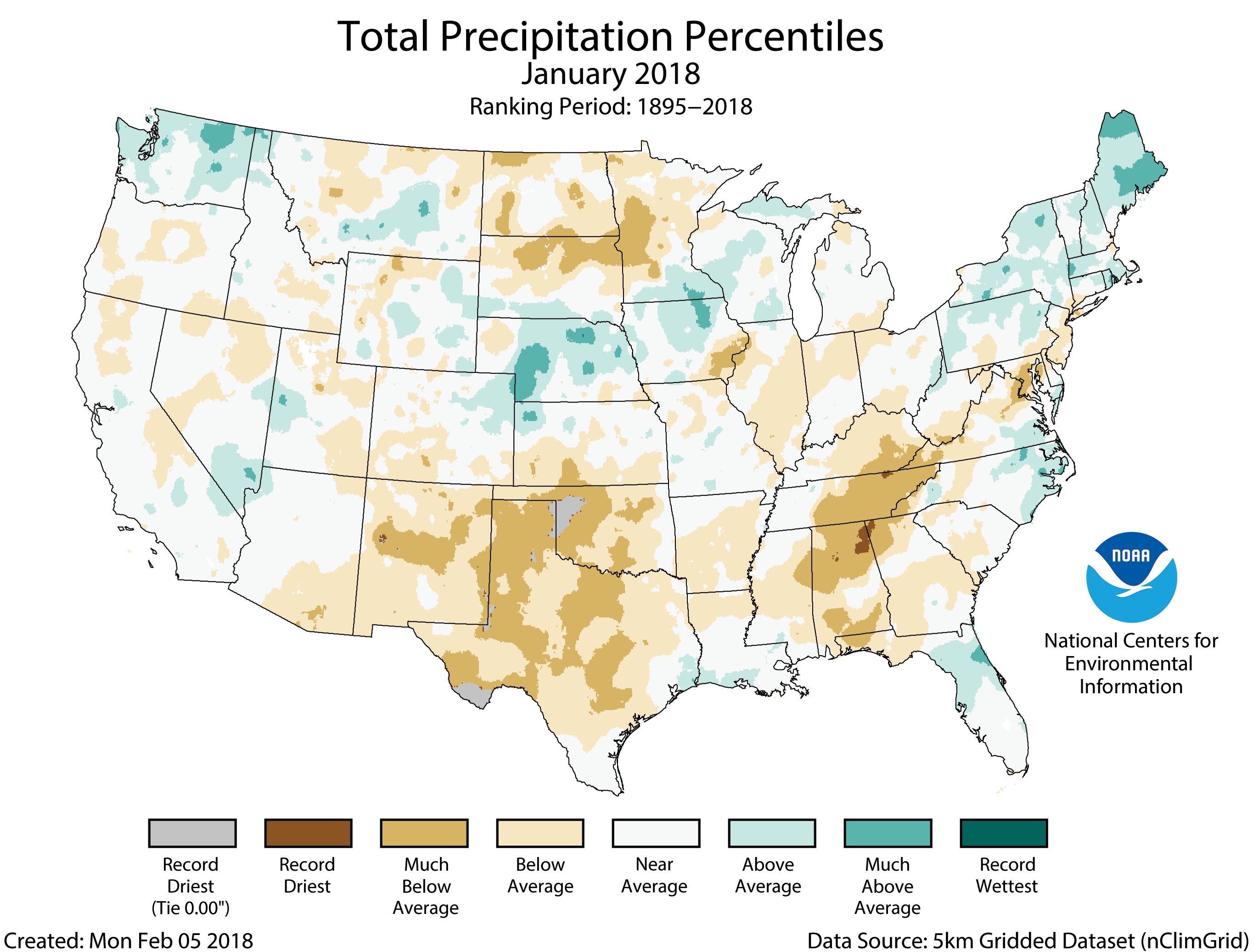 Most locations from the Rockies to the West Coast were warmer than average, where nine states had monthly temperatures that ranked among the 10 warmest on record. While no state was record warm during January, more than 2,000 daily warm temperature records were broken or tied across the region. Below-average temperatures stretched from the Southern Plains to the East Coast. Several significant cold waves impacted the eastern half of the nation during January with more than 4,000 daily cold temperature records broken or tied across the East. No state had a record cold monthly temperature. The Alaska January temperature was 6.8°F, 4.6°F above the long-term average. This ranked in the warmest third of the 94-year period of record for the state. The first half of January was mild across Alaska with a cold end to the month. On January 14, the temperature at a NOAA tide gauge at Ketchikan reached 67°F, the highest January daily temperature ever measured in Alaska. The previous record was 62°F in January 2014. January Precipitation