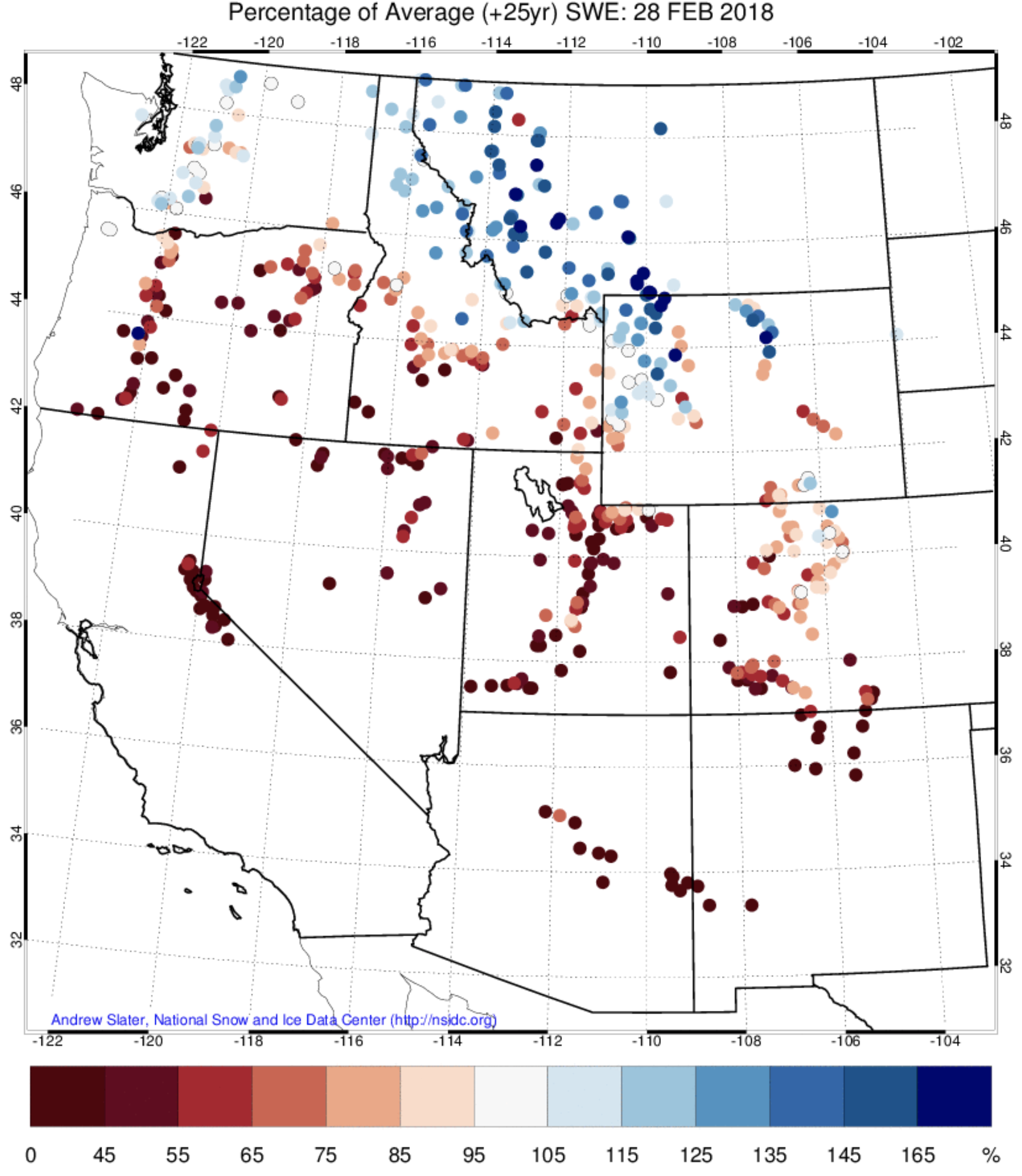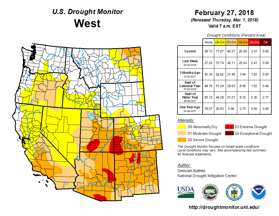 Snowpack conditions for this time of year are very low in many parts of the state. The average of the major basins’ percentage of median March 1st SWE is 74%. Individual SNOTEL station SWE throughout Colorado ranges from 21% at Grayback in the Rio Grande Basin to 131% at Buffalo Park in the Upper Colorado Basin. This winter’s drought is being felt in most parts of the Western United States, with the only major exception being the Northern Greater Yellowstone Ecosystem region of Montana, Idaho and Wyoming and parts of the Washington Cascades. Much of the Western US is seeing SWE conditions of less than half of median for this point in the year.