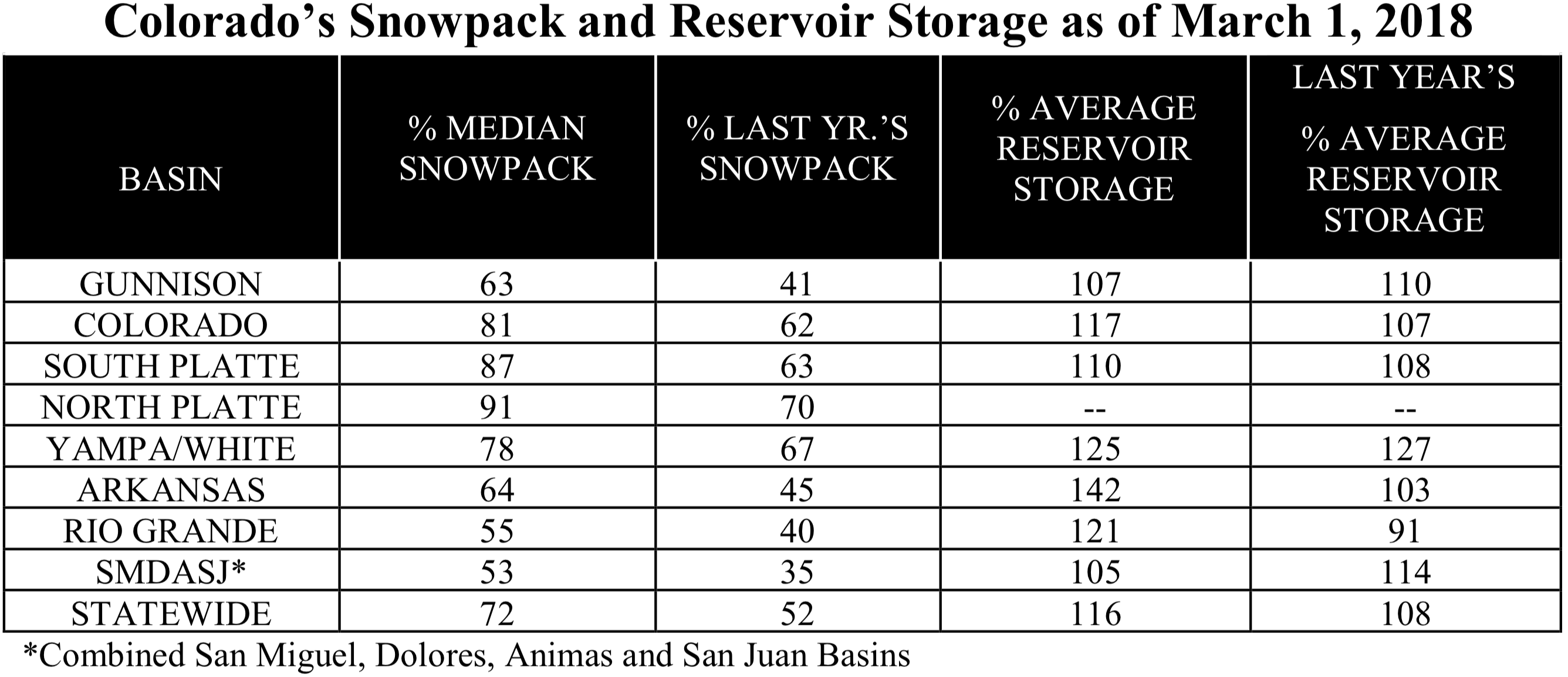 Snowpack in the North Platte and South Platte river basins are looking the best at 91 percent and 87 percent of normal, respectively. The San Miguel, Dolores, Animas and San Juan basin is faring the worst with only 53 percent of median snowpack.