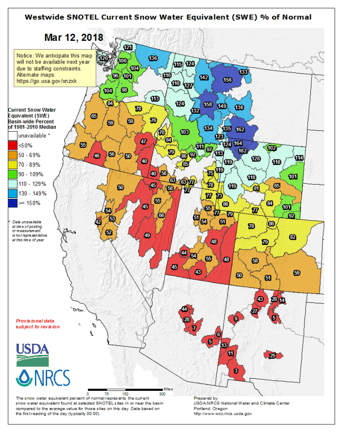 SNOTEL stations (weather-monitoring sites operated by National Resource Conservation Service) are mainly located above 10,000 feet in elevation, and even there, snowpack is at only 50 percent of normal, based on about 40 years of records. Low elevations arenāt tracked as closely.
