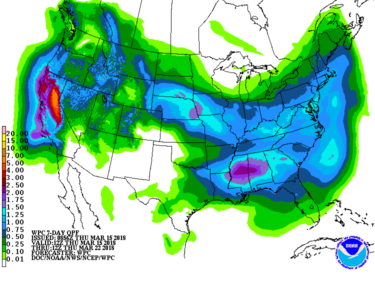 During March 15-19, 2018, most of the lower elevations in California expect moderate precipitation (0.5 to 1.5 inches). Another significant snow event is forecast in the Sierra Nevada, where precipitation totals may reach 5 inches. Elsewhere, generally moderate precipitation (0.5 to 1.5 inches) is expected across western Oregon and in broad area covering the southern Appalachians, central Gulf Coast States, Middle Mississippi Valley, central Plains, and central and northern Rockies. Amounts under 0.5 inch are expected elsewhere, with little or none falling in the desert Southwest, Upper Mississippi Valley, southern High Plains, south Texas, and Middle Atlantic States. Daily maximum temperatures should average above normal across the Southeast, the southern half of the Mississippi Valley, and the central and southern Plains. Daily average highs may average over 12 degrees F above normal across much of Kansas and Oklahoma and adjacent parts of Missouri and Arkansas. In contrast, days will stay cooler than normal through most of the Rockies and Far West, the northern Plains, and the Middle Atlantic States.