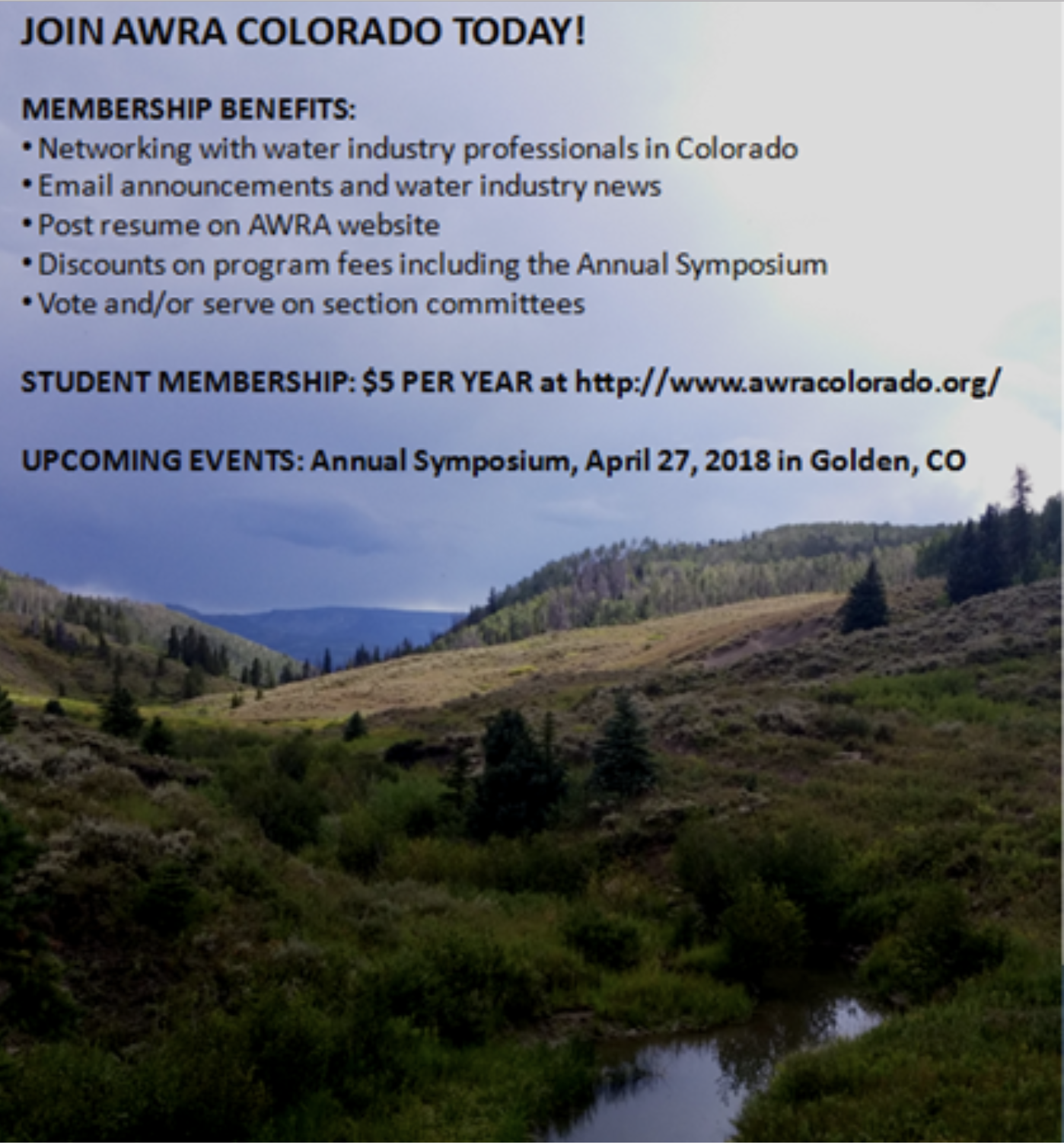 Attached is a flyer with more information; feel free to share it with anyone else that may be interested. Please note that this is a popular event with limited seating, so we encourage you to register [awracolorado.org] early, at least by the registration deadline of April 12th.
