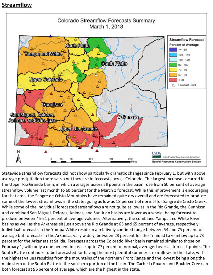Streamflow forecasts are well below average for the vast majority of the state and near normal in isolated areas including the Blue River, St. Vrain and Cache La Poudre basins (see image on reverse side).