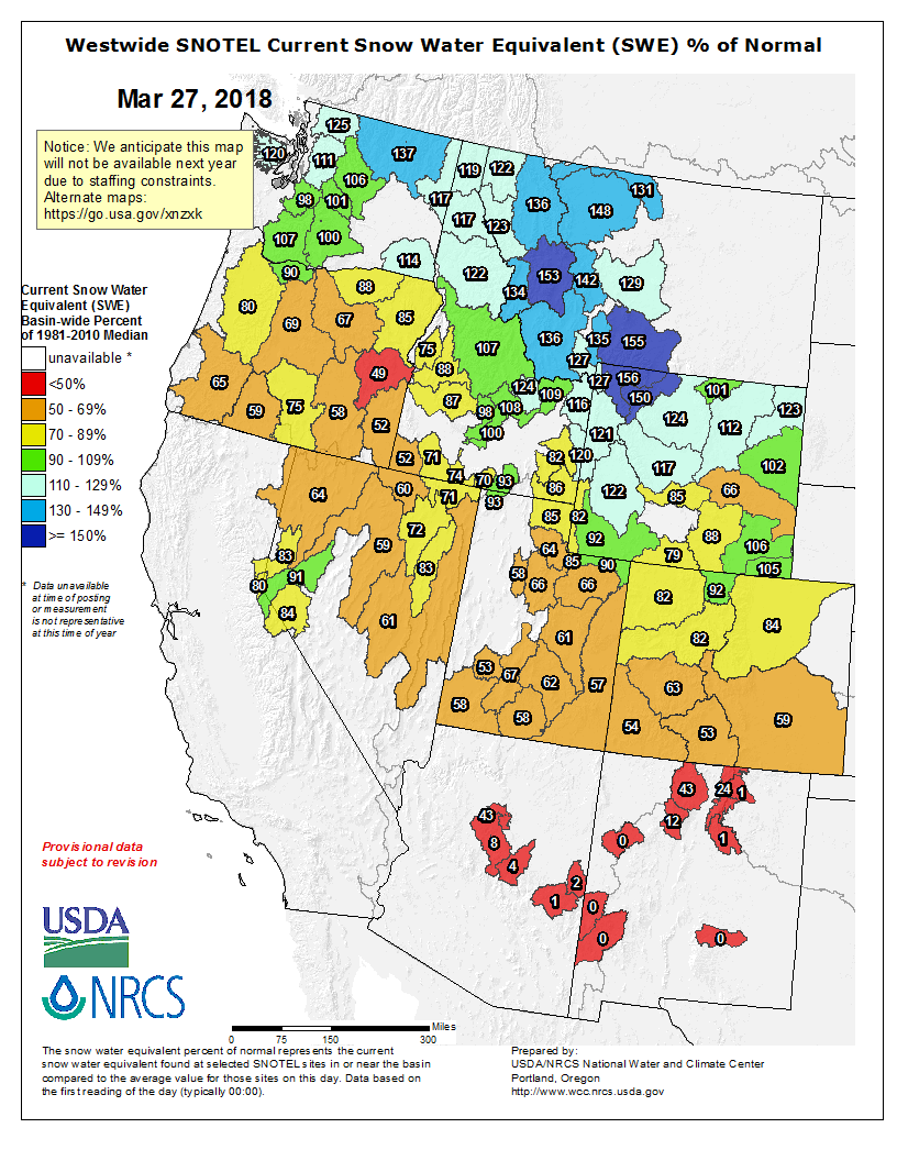Westwide SNOTEL basin-filled map March 27, 2018 via the NRCS.