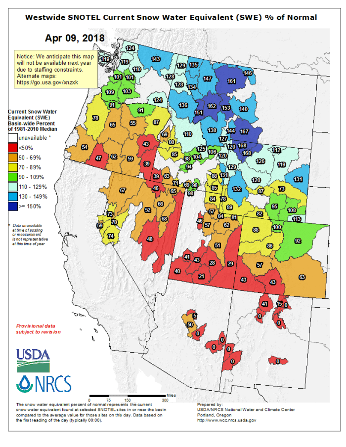 Westwide SNOTEL basin-filled map April 9 2018 via the NRCS.