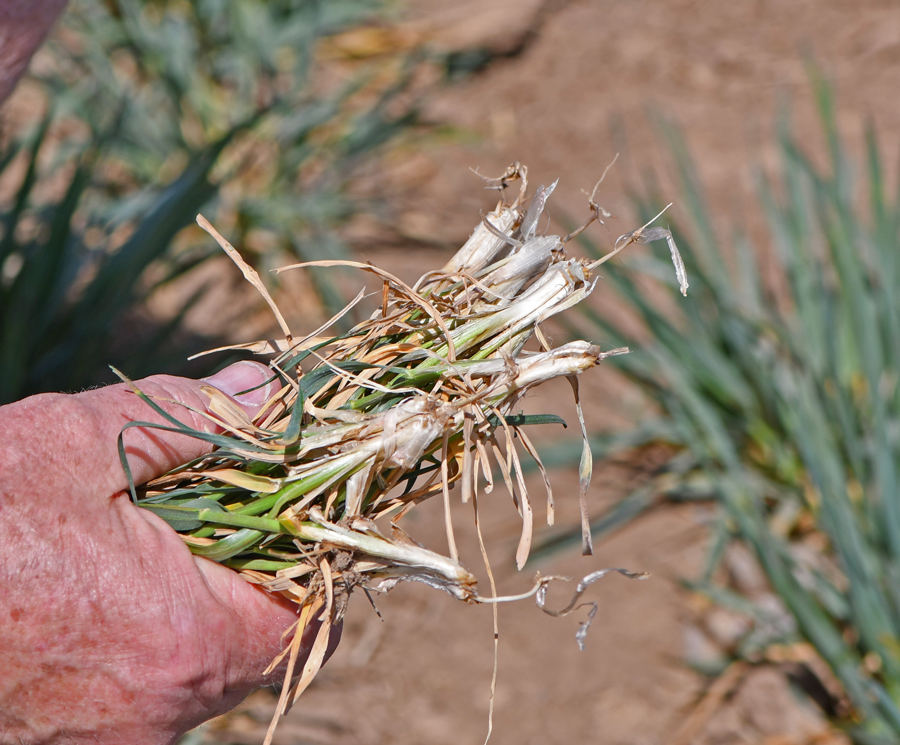“Many plants are not rooted at the crown. There may be some variety differences, but it seems to be uniform across the dryland nursery and several nearby dryland wheat fields. My first thought was an insect or a pathogen, but I really think that it is just dry.