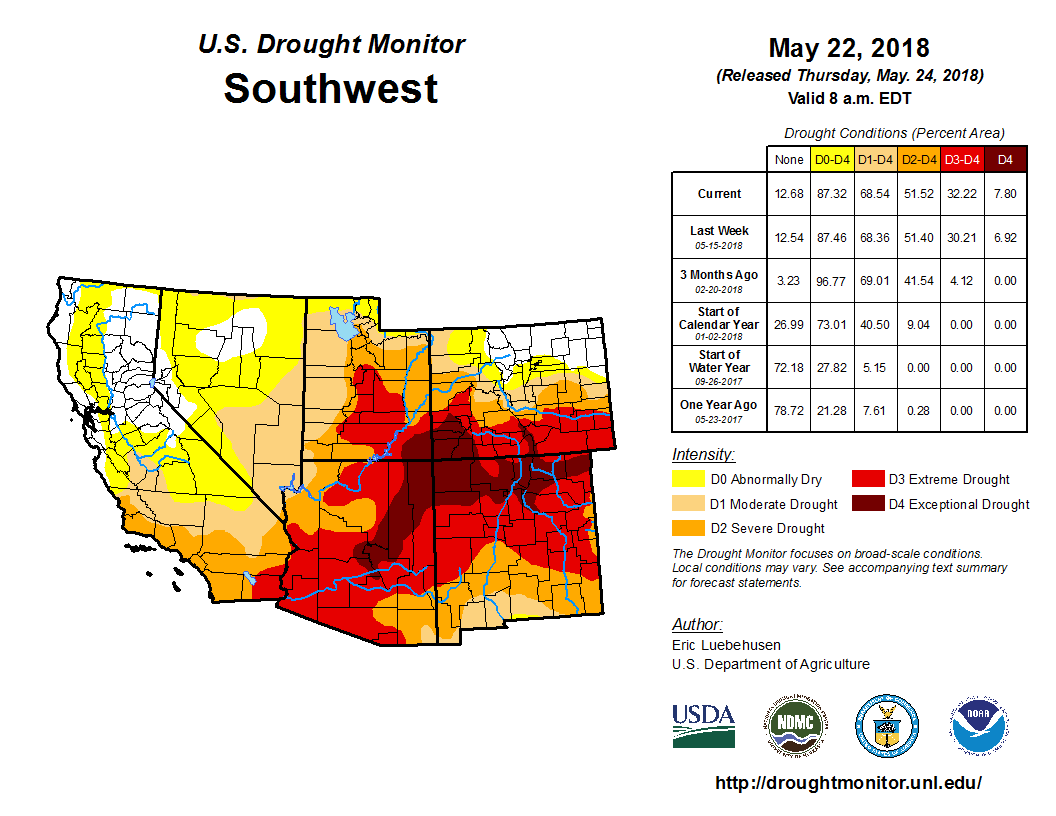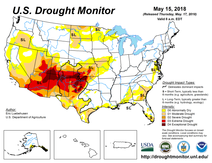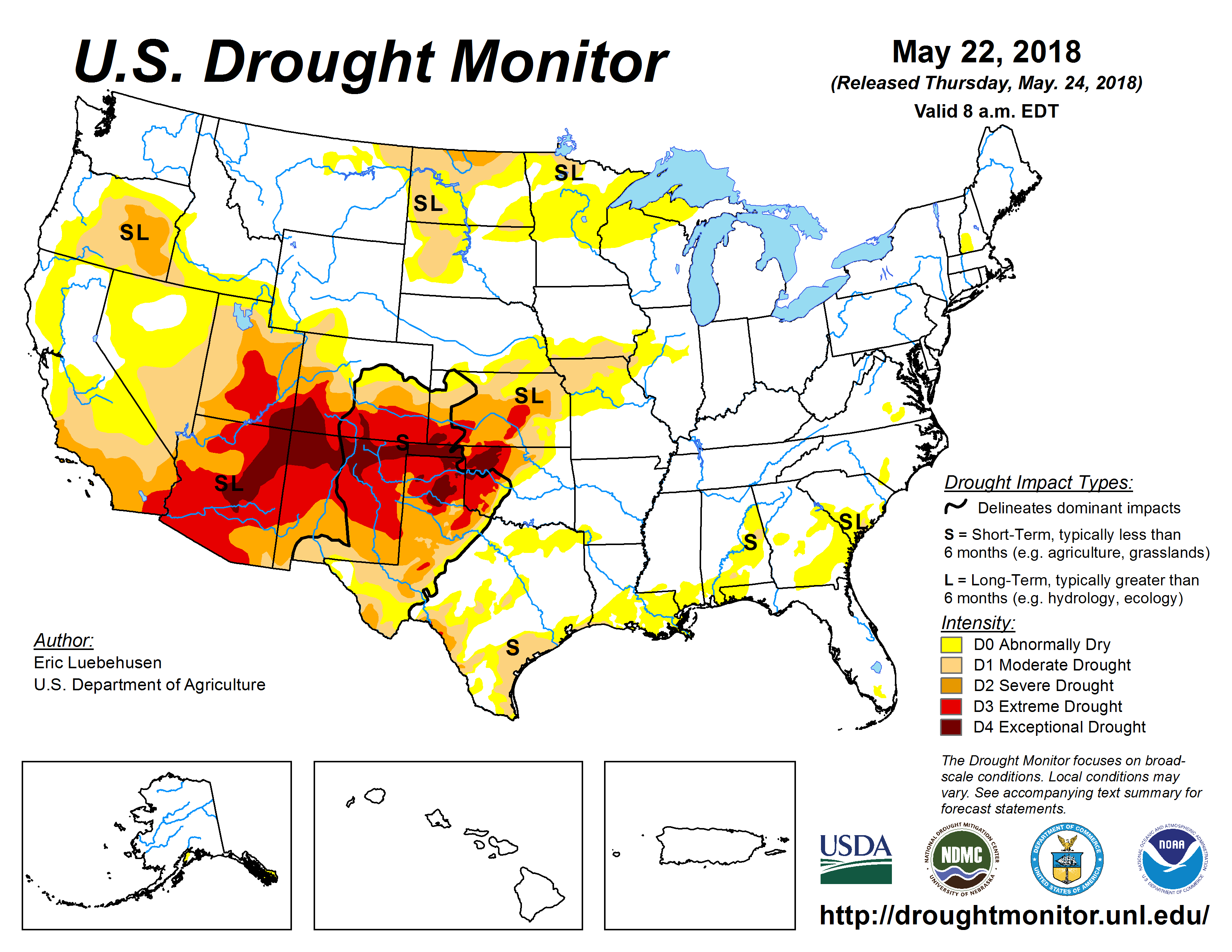Hot weather (daytime high temperatures in the 90’s) stretched from Arizona eastward to Louisiana early in the drought week, before spreading rapidly northward over the Great Plains and much of the Mississippi Valley. Some locations reported triple-digit heat during the week, associated with an amplifying ridge in the middle troposphere over the central contiguous U.S. Though the observed weekly precipitation pattern was largely convective in nature, both AHPS and ACIS depict the heavier precipitation amounts (over an inch) generally across the Southeast, the central Gulf Coast area, and the northern and central High Plains. These areas of heavier rainfall were associated with Subtropical Storm Alberto and baroclinic activity. Alberto developed early in the drought week over the western Caribbean Sea and tracked north over the eastern Gulf of Mexico. By early Monday evening (May 28th, Memorial Day), the center of Alberto crossed the Florida panhandle near Panama City. Preliminary wind reports indicated 40 mph sustained winds at Panama City, with a gust to 59 mph. Near and along Alberto’s path northward, rainfall amounts of 3-8 inches were generally received, with locally heavier amounts…