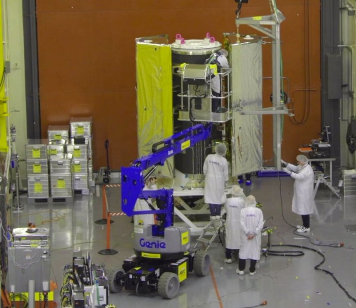 At the Harris facility at Vandenberg Air Force Base in California, one of the twin GRACE-FO satellites is integrated with the multi-satellite dispenser structure that will be used to deploy the satellites during launch. Credits: Airbus