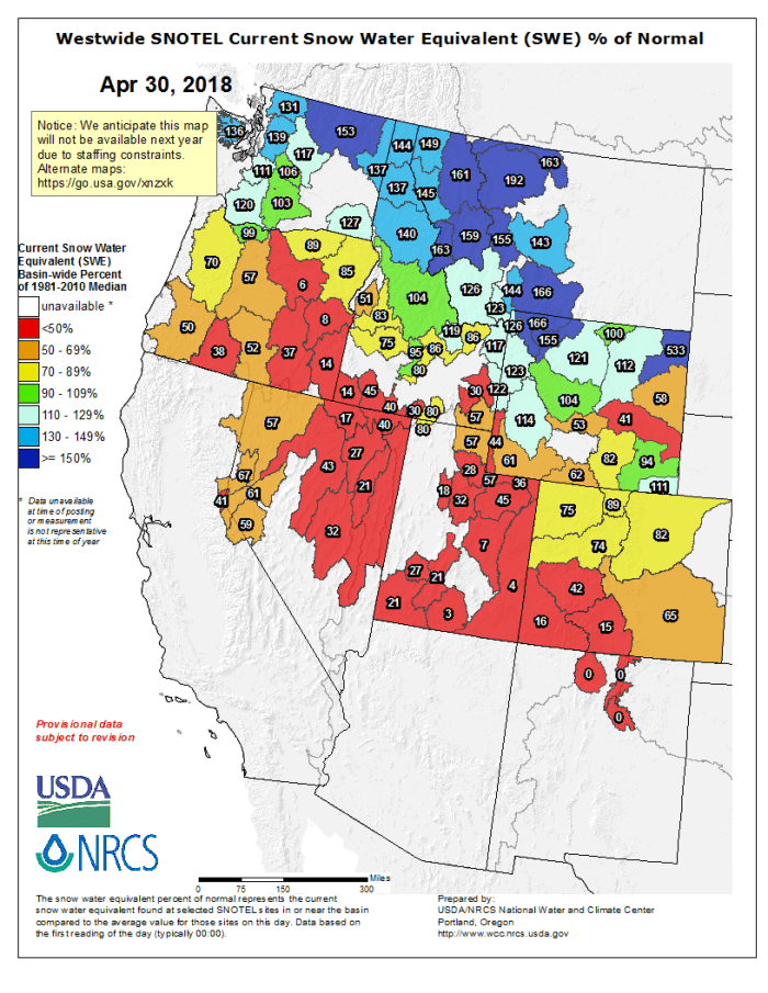Westwide SNOTEL basin-filled map April 30, 2018 via the NRCS.