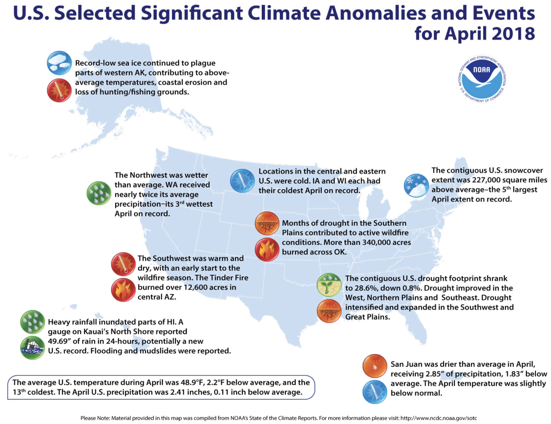 The Alaska average April temperature was 26.6°F, 3.3°F above the long-term mean. This ranked among the warmest third of the historical record. St. Paul and Cold Bay each had their fifth warmest April on record. Along the state’s west coast, sea ice continued to be much below average, contributing to the above-average temperatures. Some impacts of the low sea ice reported include coastal erosion and loss of hunting/fishing grounds.