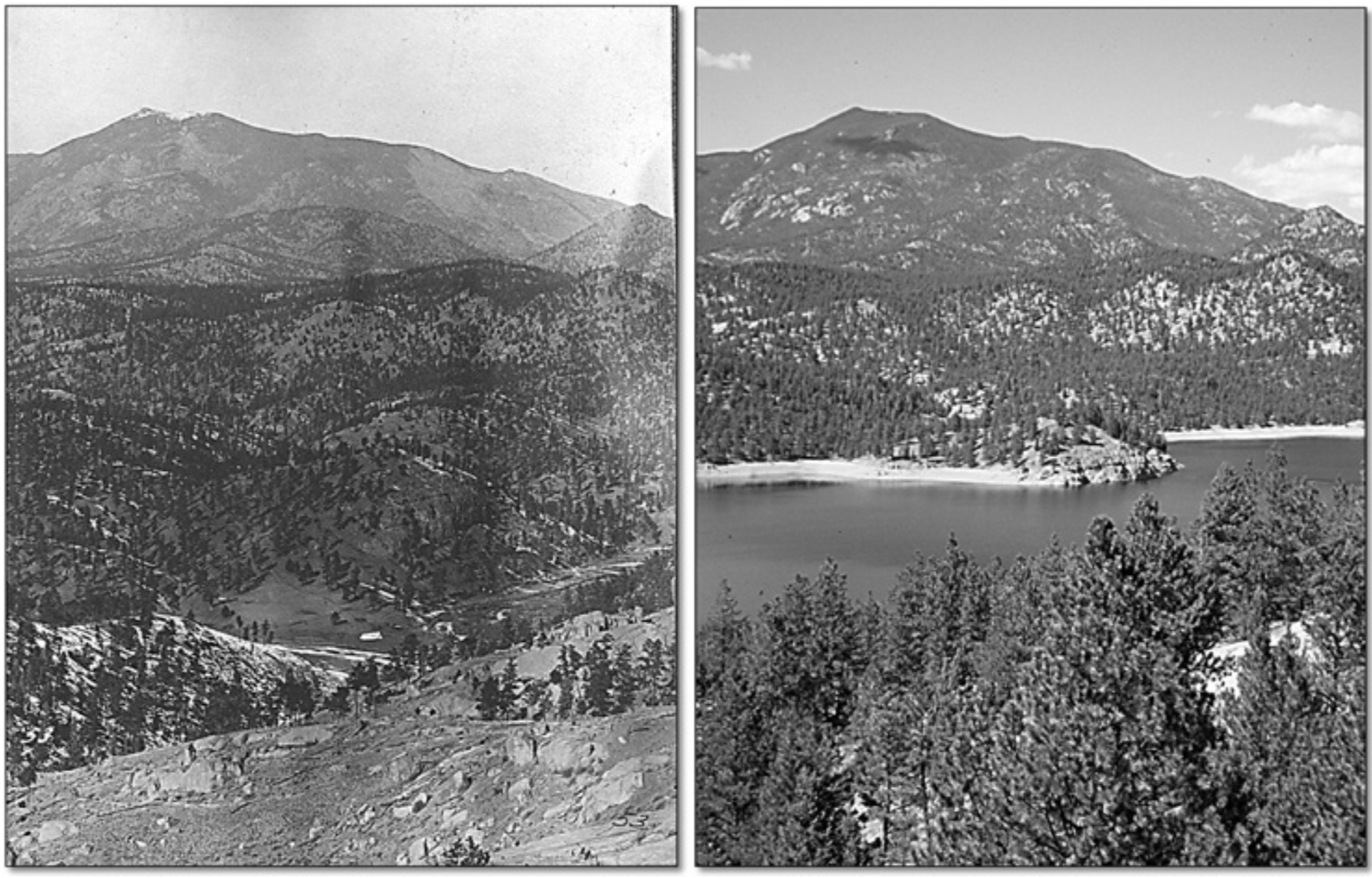 Paired historical and current photographs of the Cheesman Reservoir landscape (near Denver CO) illustrating the general increase in forest density and loss of openings that occurred from the late 1890’s to 2000. These types of paired photos can help us to give scientists a broad idea of how forests have changed over time (photos from 2000 by M. Kaufmann) via the Rocky Mountain Research Station.