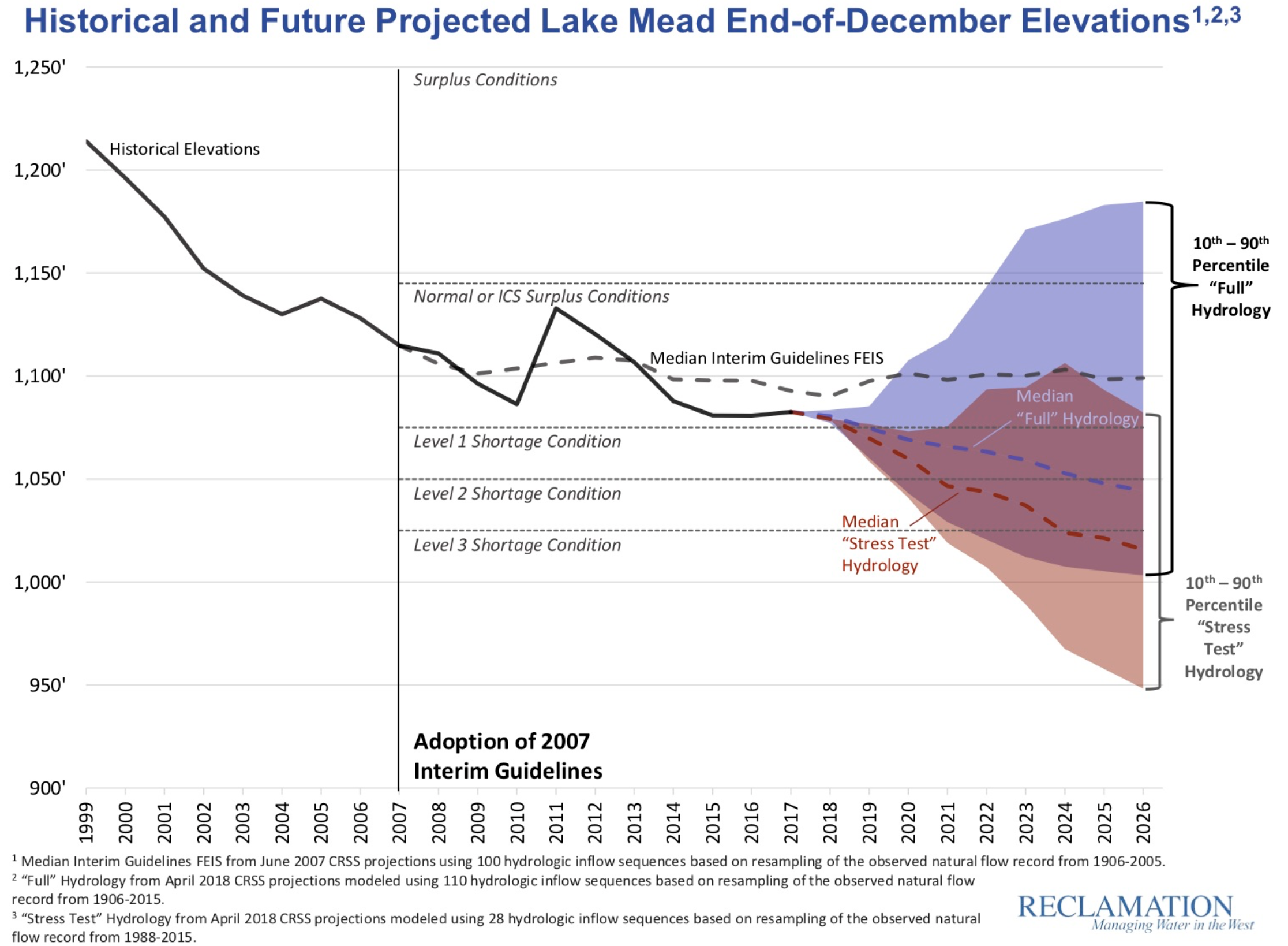 The conventional calculation of Colorado River shortage risk, which people like me frequently report, shows a 51 percent chance of Lake Mead dropping into “shortage”, below the magic trip line of elevation 1,075 at which mandatory cutbacks kick in, in 2020. But a new approach to modeling risk, which lots of folks (*cough* me *cough*) think more accurately represents the changing climate, shows a significant risk of a much quicker drop in Lake Mead’s levels, blowing quickly past 1,075, with a greater than 50 percent chance of dropping below 1,050 sometime in 2020. Absent actions to reduce water use, Lake Powell has a greater than one in four chance of dropping near power pool (the level at which it could no longer generate electricity) by the mid-2020s.
