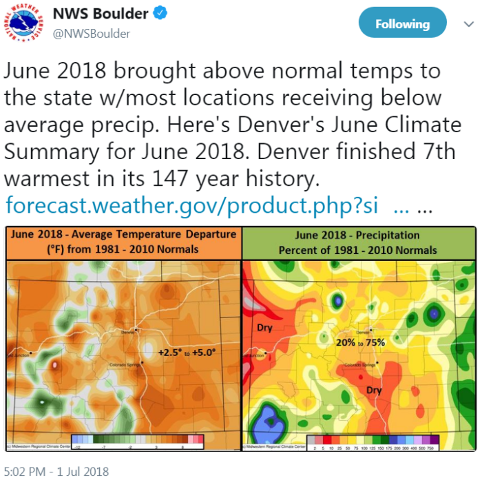June 2018 #Colorado precipitation and temperature maps Share this: Share on Bluesky (Opens in new window) Bluesky Share on LinkedIn (Opens in new window) LinkedIn Share on Facebook (Opens in new window) Facebook Email a link to a friend (Opens in new window) Email Print (Opens in new window) Print Share on X (Opens in new window) X Like this:Like Loading...