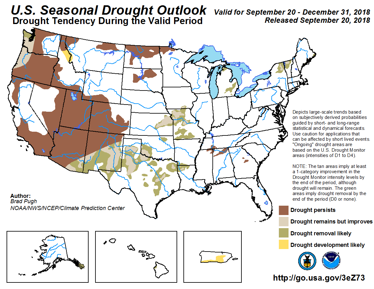 Seasonal temperature outlook through December 31, 2018 via CPC.Seasonal precipitation outlook through December 31, 2018 via CPC.Seasonal drought outlook through December 31, 2018 via CPC.