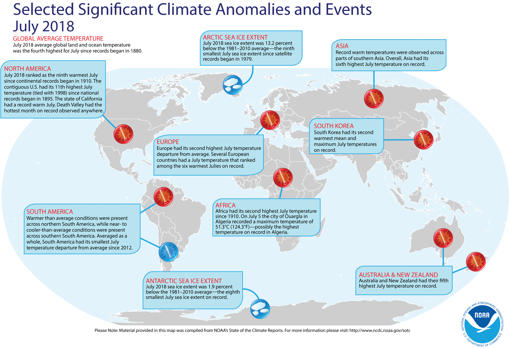 An annotated map of the world showing notable climate events that occurred in July 2018. For details, see the bulleted list below in our story and on the Web at http://www.ncdc.noaa.gov/sotc/global/2018/07. (NOAA NCEI)