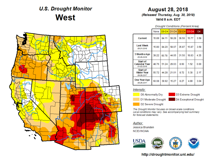 A drier than normal Water Year during the cold season (October 2017-April 2018) with less mountain snow than normal in the southern two-thirds of the West (used for spring and summer snow melt runoff), combined with a very warm and exceptionally dry summer (May-August 2018), has produced numerous negative impacts. This was most notable in Oregon where the combination of a poor winter snowpack and a hot and dry summer have produced widespread poor pasture and range conditions and very low stream flows and livestock ponds, and required water hauling, supplemental hay, and delayed forest harvesting, along with reduced livestock herds. The 4-month (May-Aug) SPEI, which takes into account temperatures and evapotranspiration with the precipitation, was below -1.5 in western Washington and Oregon by the end of August, and also in parts of eastern Oregon, northern Washington, and northern California. But since the cold season WY (Oct-Apr) was wetter and snowier in Washington and northeastern Oregon, most of the expanded D2 and D3 was added to areas with both a poor 4-month (summer) and 11-month (Oct-Aug) SPEI, namely central Oregon. Based upon the SPEI, D1 was also expanded in northwestern Washington, and D2 increased into southwestern Washington, southeastern Oregon, extreme northern California, northwestern Utah, and extreme northern Idaho where very low stream flows were occurring in the latter area. In contrast, some isolated heavy rains in southeastern Arizona (Graham County) slightly improved D2 to D1 where a short-term surplus existed…