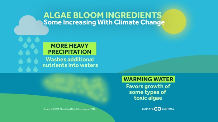 Increasing heavy precipitation — another impact of climate change — can wash more agricultural fertilizers into bodies of water, providing nutrients for the algae to thrive. And in a supercharged water cycle, the droughts that follow heavy precipitation will allow more water to evaporate from the surface, concentrating the nutrients and giving the algae the opportunity to survive longer and multiply more.