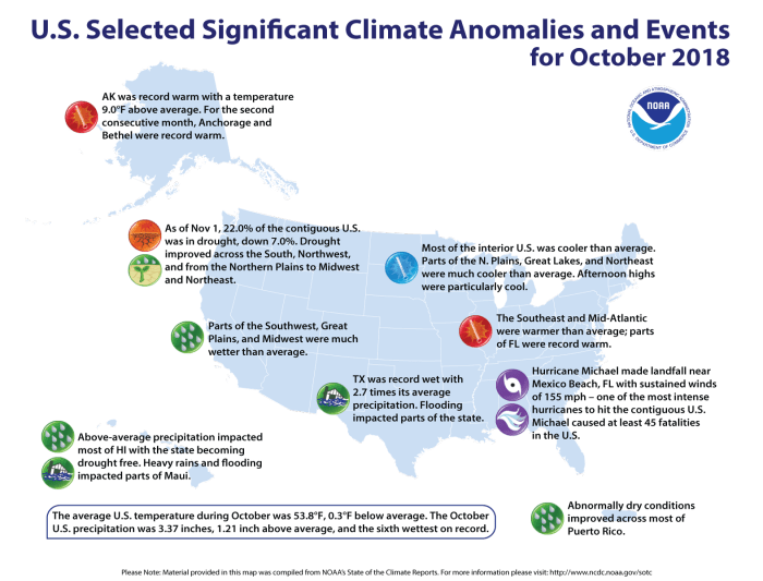 An annotated map of the United States showing notable climate events that occurred in October 2018. (NOAA NCEI)