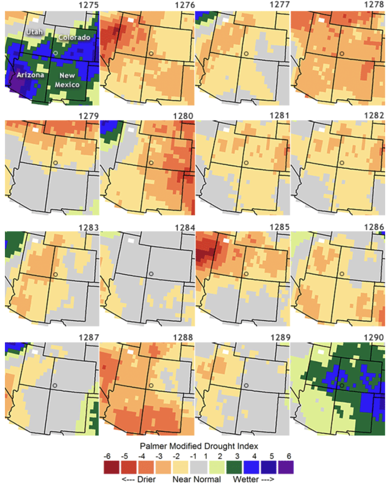 Severe drought in the U.S. Southwest in the late 1200s likely contributed to the abandonment of Mesa Verde (marked with open circle) by the Ancestral Pueblo people. Drought maps for the years 1275-1290 reconstructed from tree ring records show that over the 16-year span from 1275-1290, only two wet years occurred. Graphic by Climate.gov, based on summer drought reconstructions from the Living Blended Drought Atlas, courtesy of NOAA and Cook et al., 2010, Journal of Quaternary Science, 25(1), 48-61. doi: 10.1002/jqs.1303.