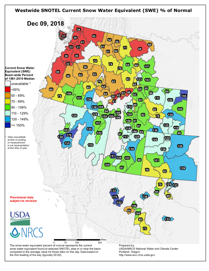 Natural Resource Conservation Service Snotels, a group of monitors that measures snowfall at various elevations in the San Juan Mountains, showed the combined Dolores and San Miguel river basins at 96 percent of normal as of Dec. 7. The Animas River Basin was at 96 percent of normal.