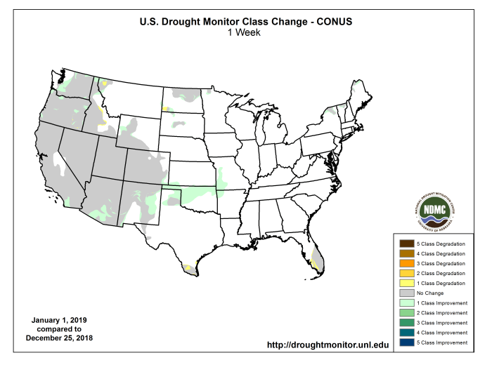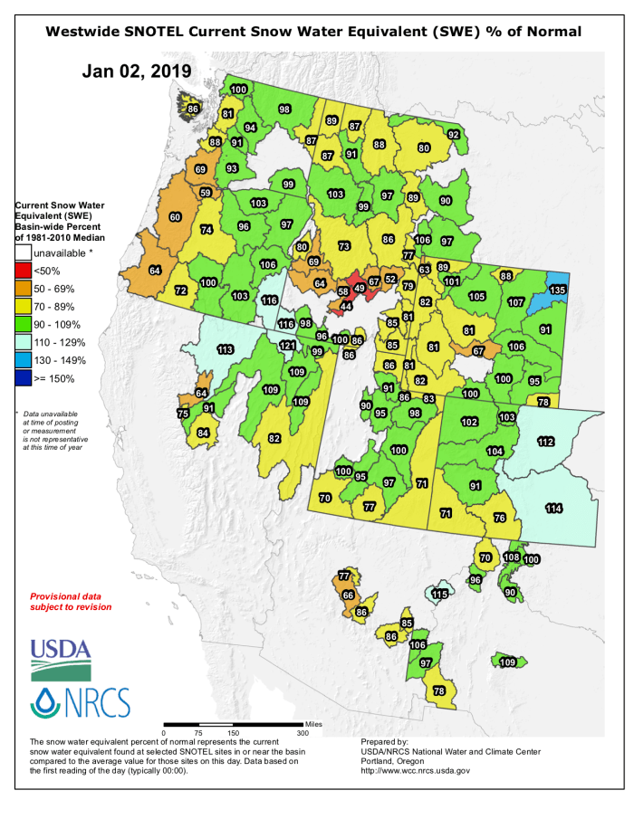 The January 1, 2019 NRCS SNOTEL WYTD basin average precipitation and SWC [Snow water content] generally improved this week with the storm systems. Basin average SWC was close to normal (85-120% of normal) in most Western basins except (less than 85%) in the northern Sierras, western Oregon, south-central Idaho, southern Utah, central Arizona, and southwestern Colorado. Basin average precipitation was similar to SWC, with WYTD average precipitation close to normal in most basins (75-125%); however, southern Oregon, northern California, and south-central Idaho basins were less than 75% of normal. As a result, some slight 1-category improvements were made in western Washington and northwestern Oregon, northeastern Washington, northern Idaho, and northwestern Montana. Some D0 was trimmed from western Wyoming with the recent precipitation, and some slight improvement and smoothing of the D3 area of eastern Oregon was made. In contrast, a slight expansion of D0 into south-central Idaho was necessary due to the poor WYTD so far. In-between the northern and southern systems, no changes were made.