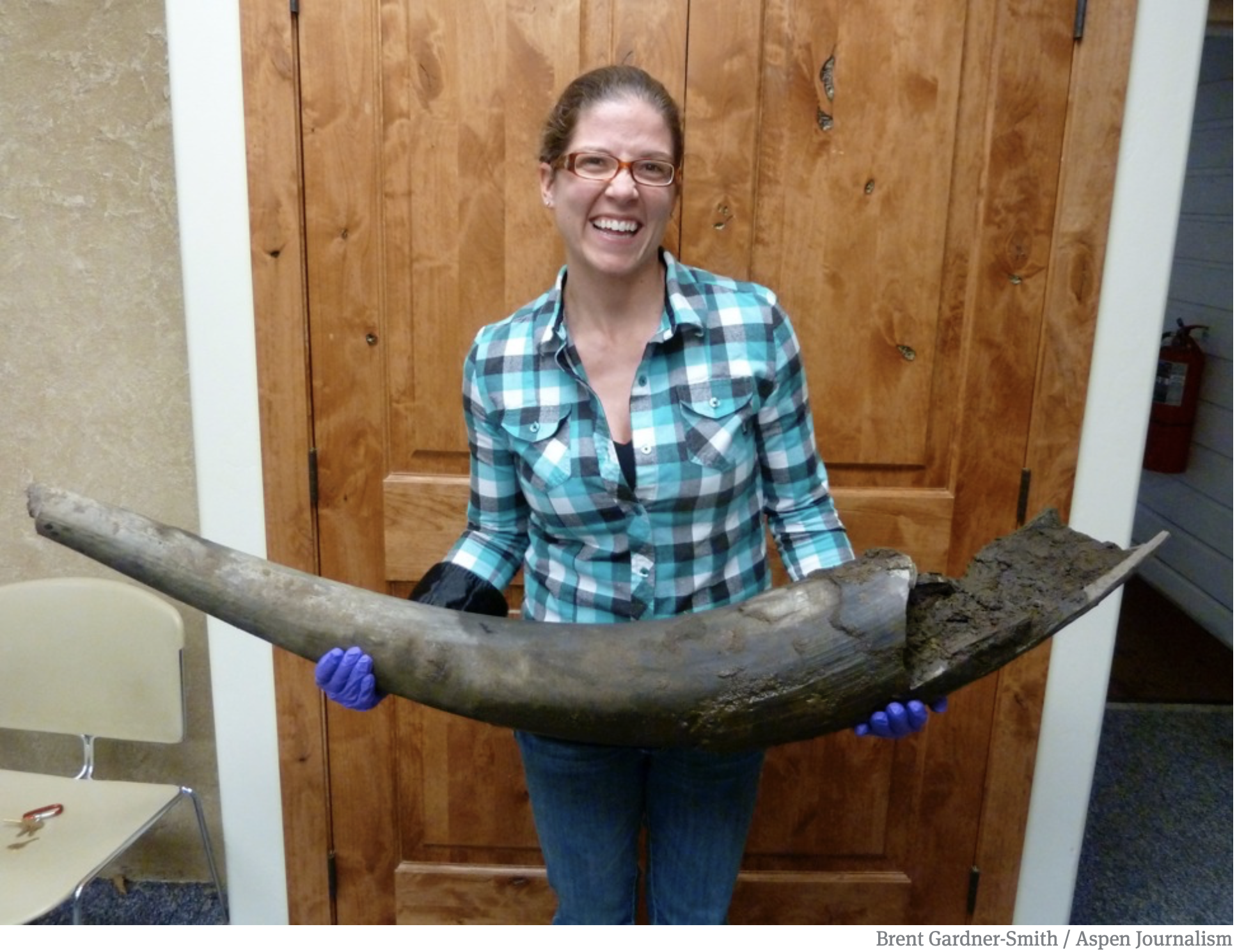 Christie Duckett, an employee of the Snowmass Water and Sanitation District, with an ancient 50-pound tusk in the district’s office, shortly after it had been dug out of the ground by construction workers in 2011 at what is now an expanded Ziegler Reservoir. Photo credit: Brent Gardner-Smith/Aspen Journalism