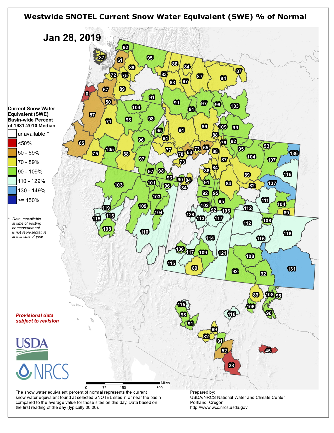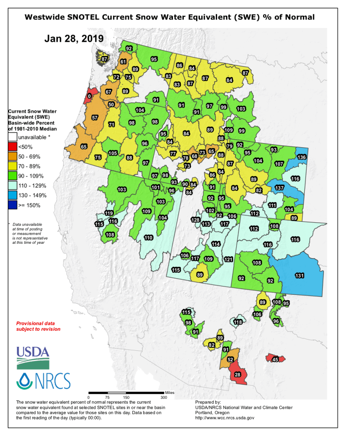 Westwide basin-filled SNOTEL snowpack map January 28, 2019 via the NRCS.