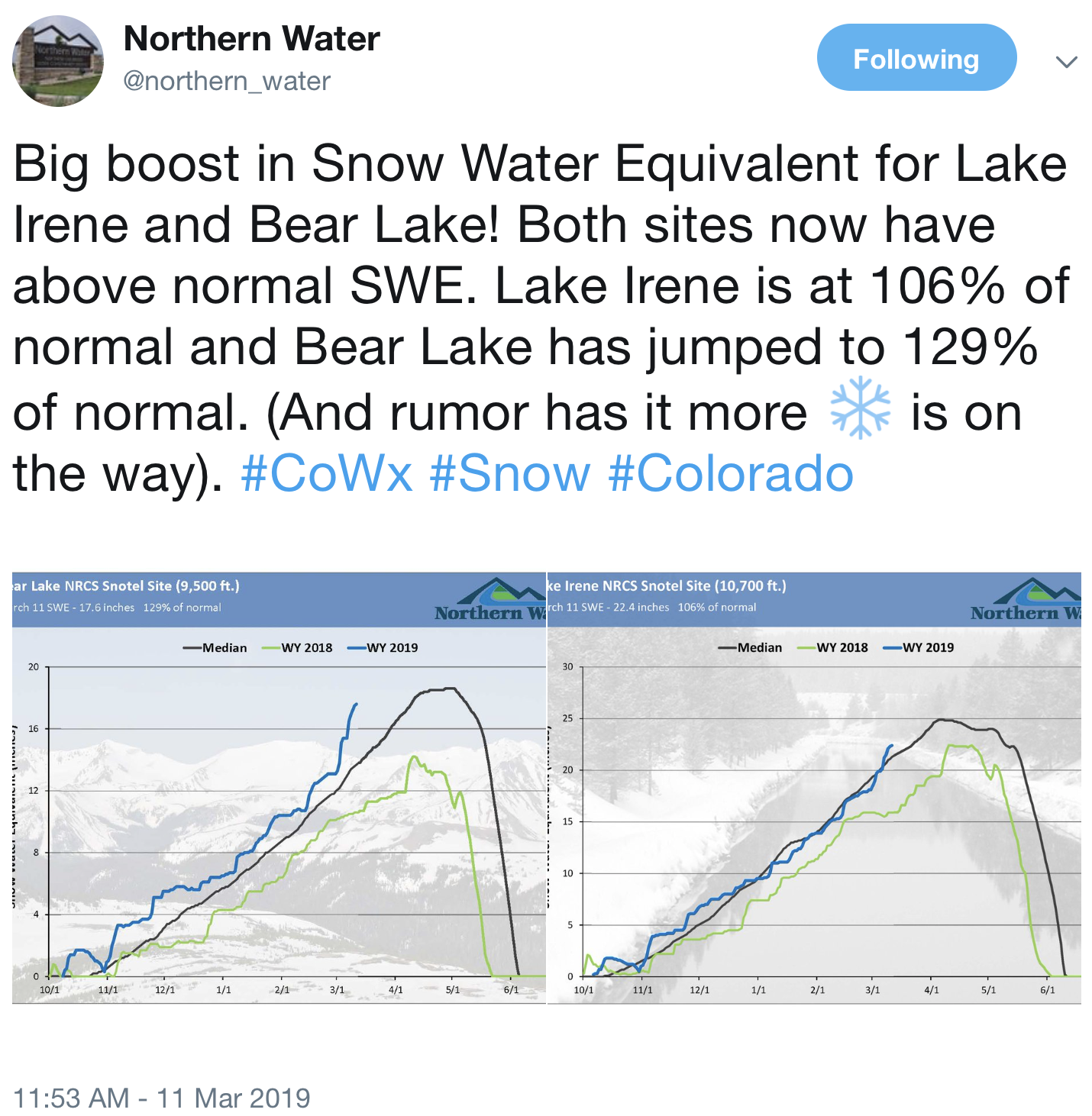 South Platte River Basin High/Low graph March 11, 2019 via the NRCS.