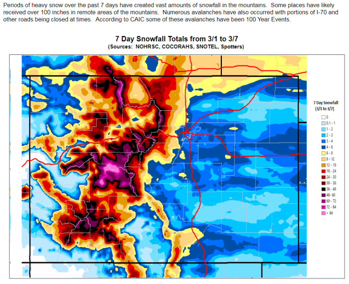 The snowpack news is great for Colorado today. Below is a graphic from NOAA depicting snowfall totals from March 1 through March 7, 2019.