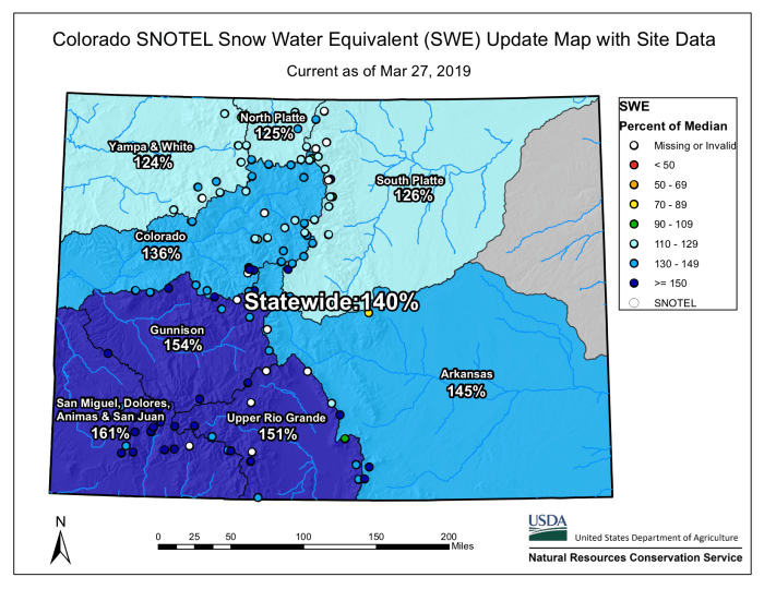 Across the state, snow water equivalent stood at 140 percent, with all basis reporting 124 of the median or greater.