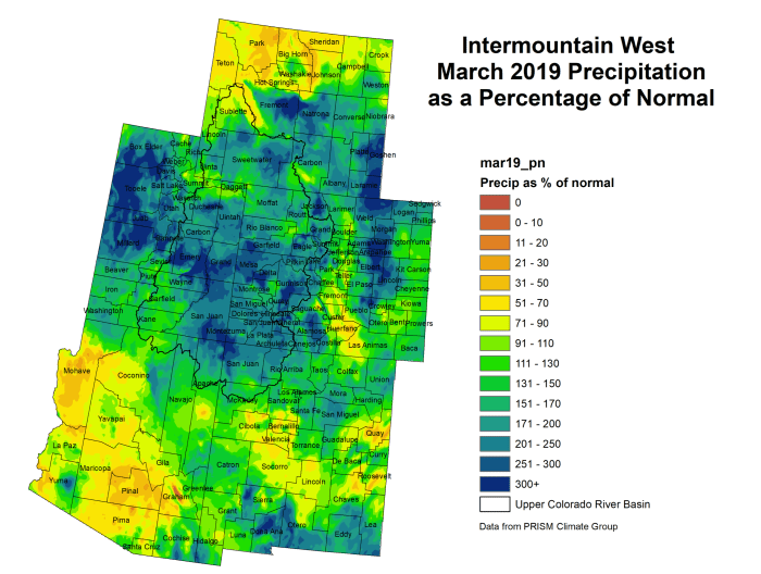 @ColoradoClimate: March 2019 precipitation as a percent of normal for the Intermountain West March 2019 Intermountain West precipitation as a percent of normal via the Colorado Climate Center. Share this: Share on Bluesky (Opens in new window) Bluesky Share on LinkedIn (Opens in new window) LinkedIn Share on Facebook (Opens in new window) Facebook Email a link to a friend (Opens in new window) Email Print (Opens in new window) Print Share on X (Opens in new window) X Like this:Like Loading...