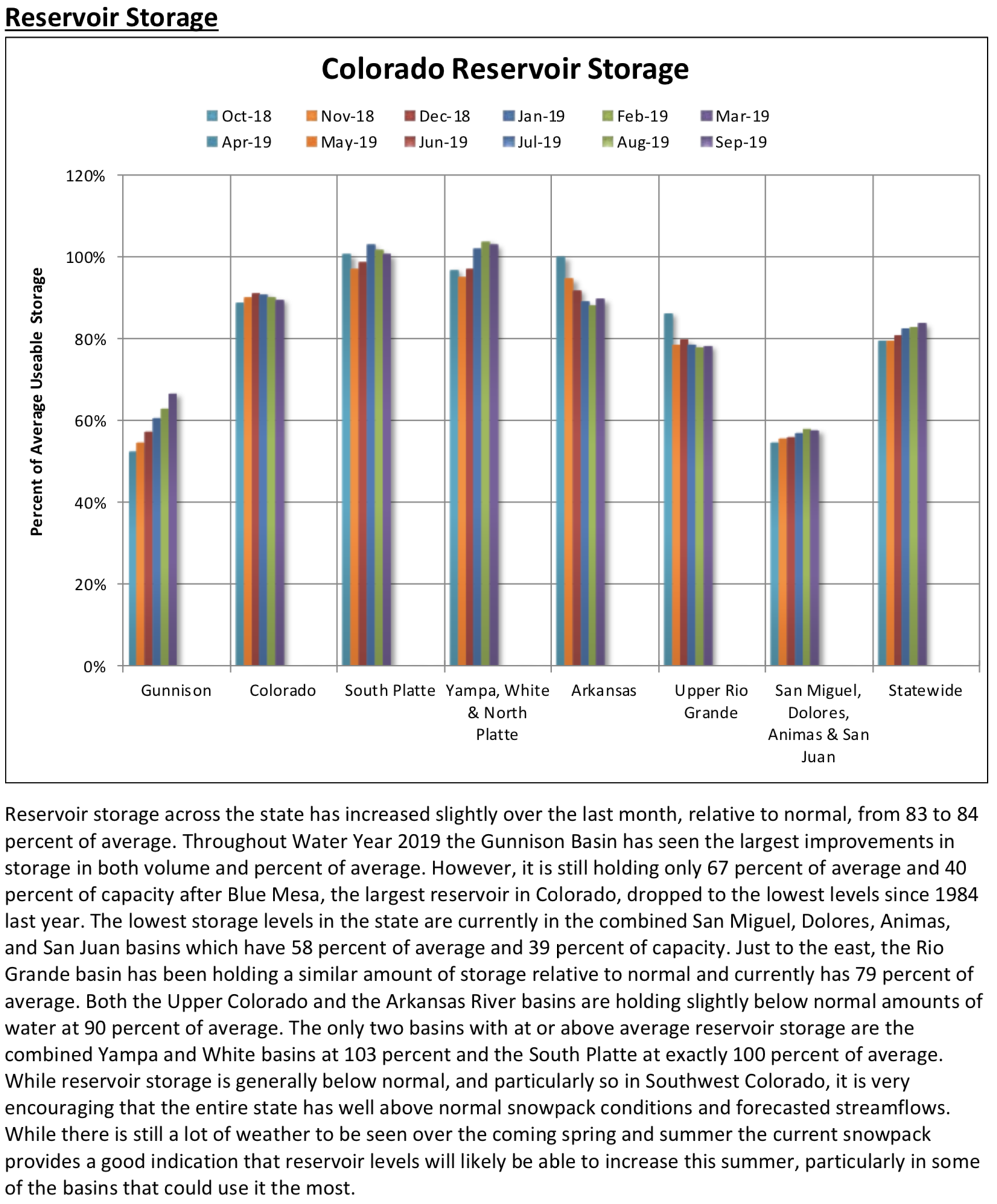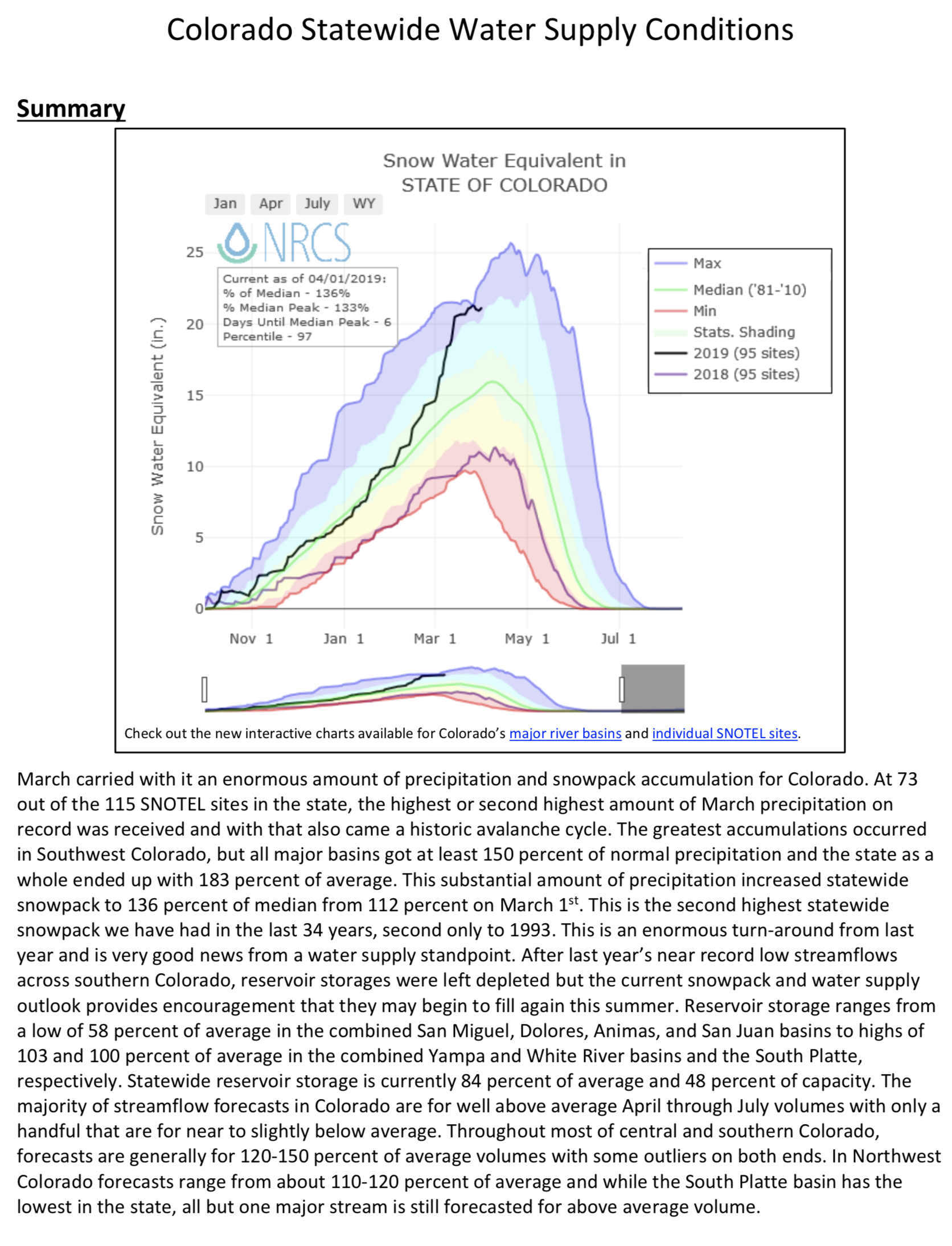 March snowpack improvements showcase the impressive changes but equally noteworthy are current snowpack totals for the water year beginning on October 1. Snowpack observation points within the San Miguel, Dolores, Animas & San Juan combined basins indicate 157 percent of median, while snowpack in the Gunnison, Arkansas, Rio Grande, and Colorado indicate 150, 149, 145 and 130 percent of median respectively. “Current snowpack values in some individual basins on April 1, 2019 translate to nearly double or triple levels seen during this same time last year,” comments Domonkos. These improvements over last year are welcomed in restoring water supplies significantly depleted after last year’s drought.