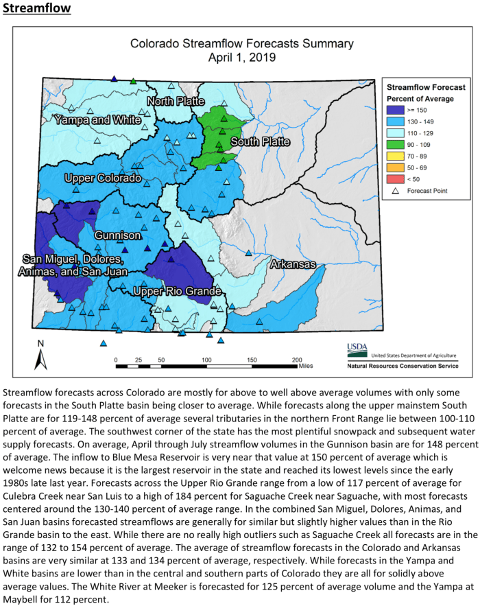 The largest increases in water supply forecasts between March 1st and April 1st occurred in the San Juan, Gunnison, and Dolores River Basins. Significant increases also occurred throughout the San Rafael and Sevier River Basins in central and southwest Utah. Due to record February-March precipitation amounts in these areas, April-July runoff volume forecasts range from near 115 to 200 percent of average. Currently only parts of the Green River Basin in Wyoming and the northern Great Basin (Bear River Basin) have forecasts below average for the 2019 season.