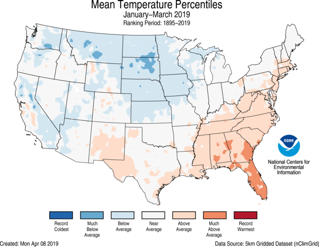 During mid-March, a “bomb cyclone” developed across the central U.S. bringing snow, blizzard conditions, heavy rainfall and above-freezing temperatures across parts of the interior U.S., which already had significant snowpack on the ground. This resulted in widespread flash flooding due to the combination of new rainfall, rapidly melting snow and frozen ground. A State of Emergency was declared for parts of Nebraska, Iowa, South Dakota and Wisconsin as the Missouri, Platte and Mississippi rivers breached their banks. Above-average precipitation was observed across parts of the West, central Rockies and into the central Plains and middle Mississippi Valley. This precipitation exacerbated the flooding that occurred during the latter half of March in the central U.S. Flooding along these major rivers and tributaries is anticipated to continue well into April. Below-average precipitation was observed across the Northwest, South, Southeast and East Coast. Washington and Montana had one of their 10 driest Marchs on record. According to the April 2 U.S. Drought Monitor report, 6 percent of the contiguous U.S. was in drought, down from 12 percent at the end of February and is one of the smallest contiguous U.S. drought footprints on record. Drought conditions continued to improve across much of the West and intensified across parts of Washington, Texas and the Southeast. January–March (Year-to-Date) Temperature