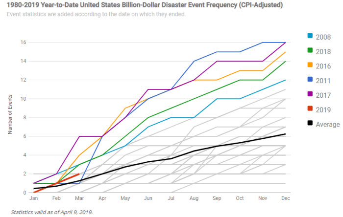 In the first three months of 2019, there were two weather and climate disaster events with losses exceeding $1 billion each across the U.S. These events included a severe storm event across the Southeast, Ohio Valley and Northeast, and one flooding event in the central U.S., which is still ongoing.